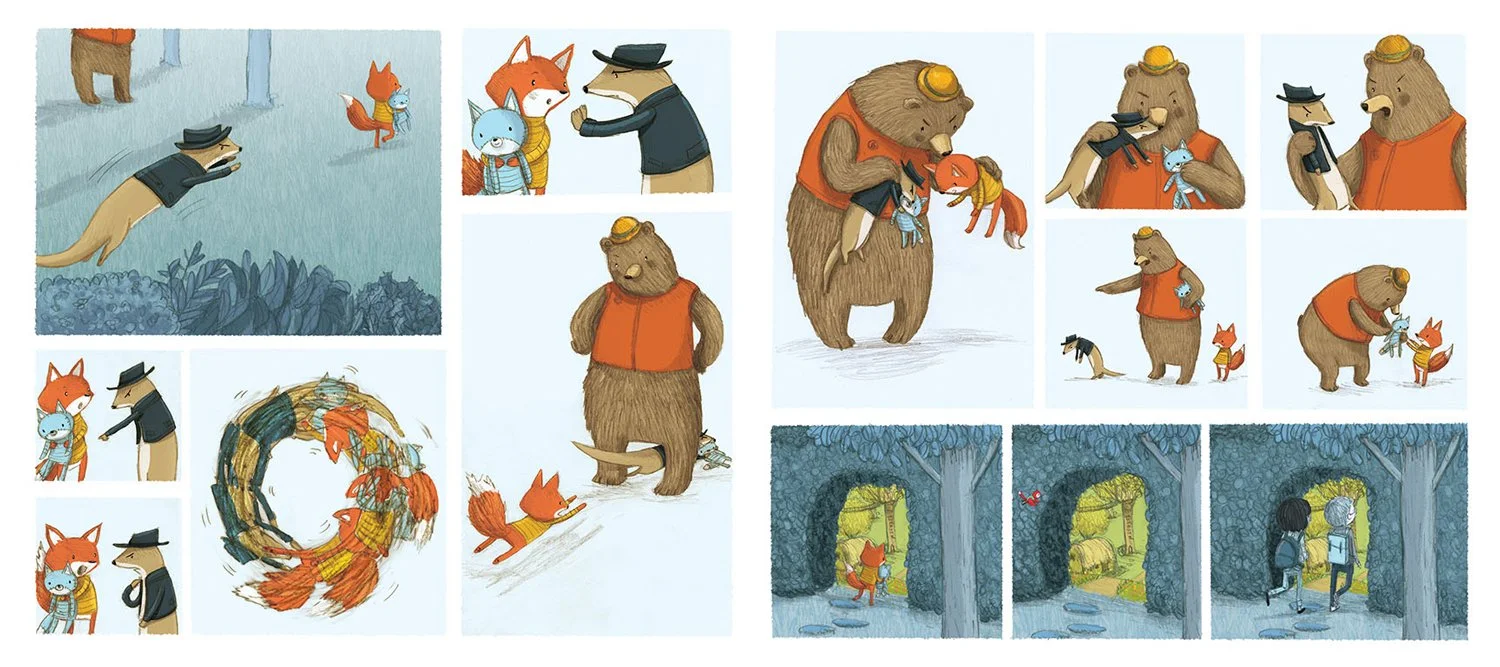 I read as many wordless picture books as I could find, uncovering how others tackled pacing and structure. I knew that I wanted some big moments to open up in full page spreads to give a cinematic feel. Emotions needed to be conveyed clearly, and the storyline needed to be easy for the youngest readers to follow.