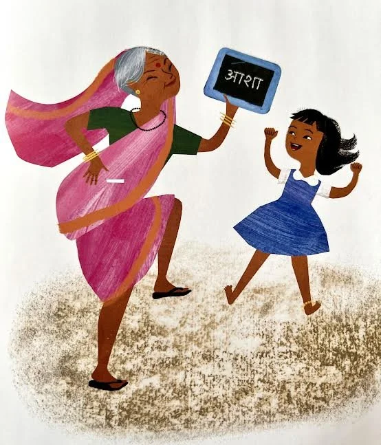 Grandmother School was inspired by true events that happened in 2016 in Phangane, a small village in Maharashtra, India. It is so remote that you probably wouldn’t find it on the map. I read a news clip that Yogendra Bangar, the village teacher thought to himself – that everyone in the village could read, write, and do enough math to get by except the 29 grandmothers. So, he built Aajibaichi Shala, a one room school for grandmothers. He invited them to attend, provided them with school bags and gave them bright pink saris as uniforms. They were all over the age of sixty, and the oldest grandmother was ninety. Some were hard of hearing and many of them forgot what they had learned too easily, but they all came, dressed in their bright pink saris. They were excited to go to school for the first time in their lives. I fell in love with the story.